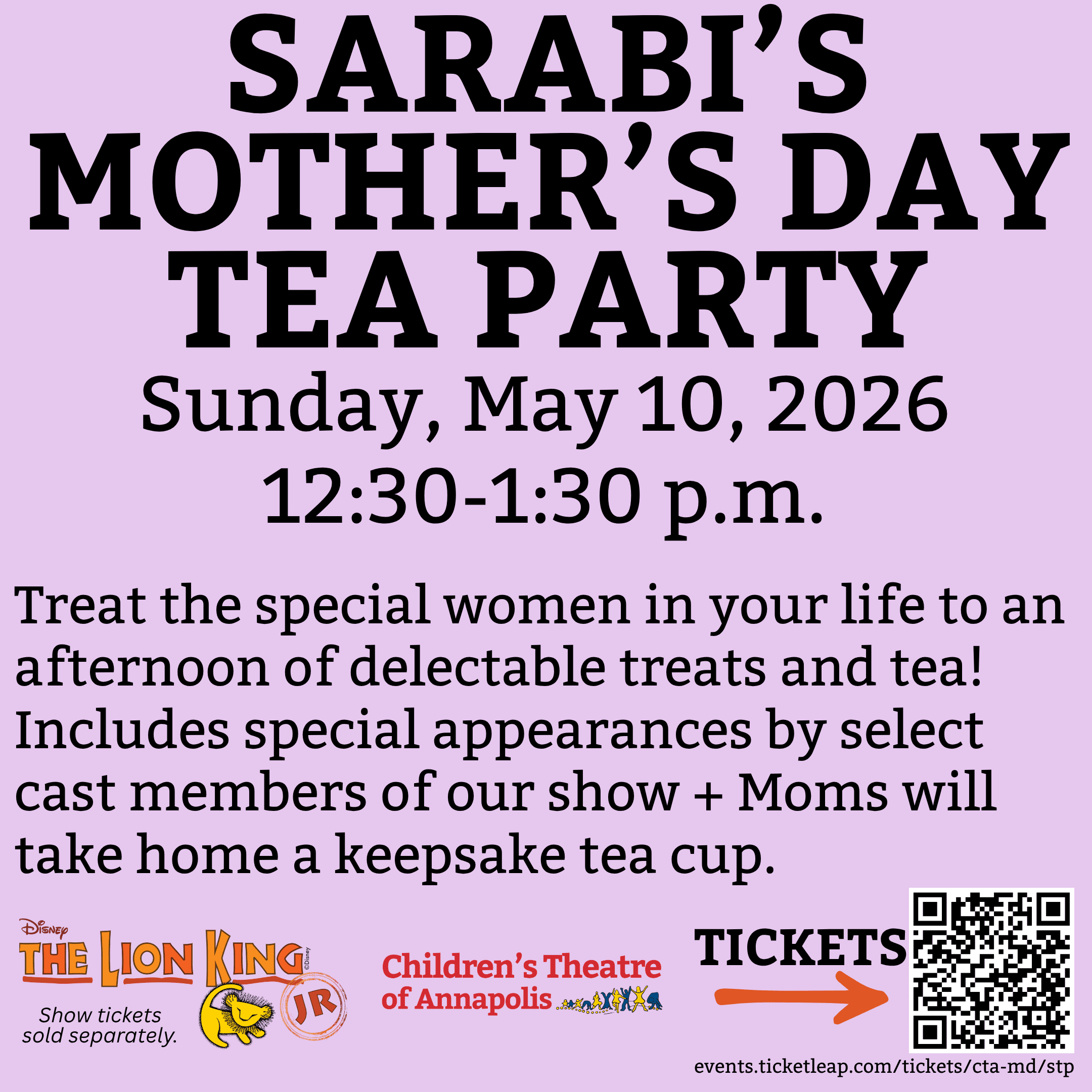 Treat the special women in your life to an afternoon of delectable treats and tea at our Mother’s Day Tea Party! We’ll have special appearances by select cast members of CTA’s production of Disney’s The Lion King JR. Moms will take home a keepsake tea cup. Let’s make memories over tea.